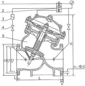 當管道從進水端給水時,水流過針閥進入主閥控制室,出口壓力通過導管作用到導閥上,當出口壓力高于導閥設定值時,導閥關(guān)閉,控制室停止排水,此時主閥控制室內(nèi)壓力升高并關(guān)閉主閥,出口壓力不再升高。